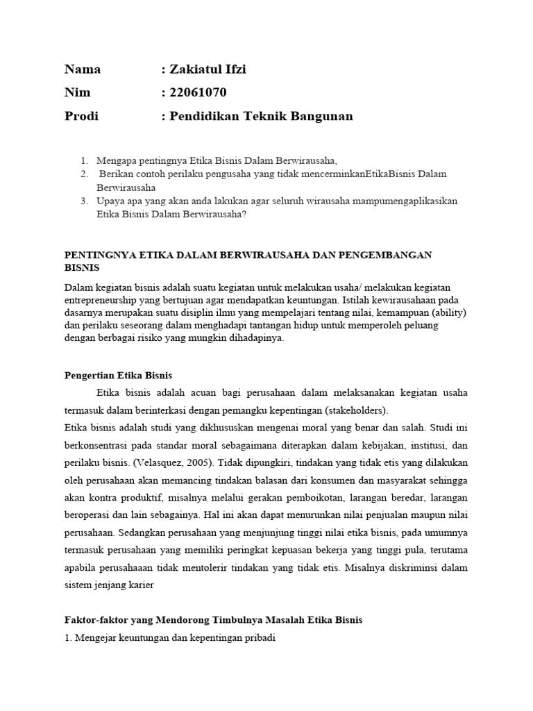 Bagi siswa SMK, memahami pentingnya etika dalam berwirausaha adalah langkah awal yang sangat penting. Etika bukan hanya sekadar aturan formal, tetapi juga nilai-nilai moral yang menjadi dasar dari kepercayaan dan kredibilitas. Dalam dunia bisnis, etika membantu kita menjaga hubungan baik dengan pelanggan, rekan kerja, dan masyarakat sekitar. Dengan menerapkan etika, kita bisa membangun bisnis yang berkelanjutan dan bermanfaat bagi banyak pihak. Etika dalam berwirausaha juga berkaitan erat dengan nilai-nilai Islam dan Muhammadiyah, seperti ilmu yang amaliah dan amal yang ilmiah. Artinya, pengetahuan harus diwujudkan dalam tindakan nyata, dan tindakan harus didasari oleh ilmu yang benar. Dengan demikian, setiap langkah dalam berbisnis harus dilakukan dengan kesadaran bahwa kita bertanggung jawab kepada Allah dan sesama manusia. Apa Itu Etika Bisnis? Etika bisnis merujuk pada standar dan prinsip moral yang mengatur perilaku dan praktik individu serta organisasi dalam dunia bisnis. Dalam konteks wirausaha, etika mencakup sikap jujur, adil, bertanggung jawab, dan menghormati hak orang lain. Menurut buku Pengantar Etika Bisnis (2023) oleh Gilad James, etika bisnis tidak hanya tentang bagaimana bisnis berjalan, tetapi juga bagaimana bisnis memberikan manfaat secara adil dan berkelanjutan. Dalam Islam, etika bisnis juga ditekankan melalui ajaran Al-Qur’an dan Hadis. Misalnya, dalam Surah Al-Baqarah ayat 282, disebutkan bahwa kita harus menunaikan amanah dan menjaga kejujuran. Hal ini menjadi pedoman bagi para pengusaha Muslim agar tidak melakukan penipuan atau manipulasi dalam bisnis. Mengapa Etika Penting dalam Berwirausaha? Etika dalam berwirausaha memiliki peran penting dalam menjaga reputasi dan kepercayaan. Jika seseorang tidak menjunjung etika, maka bisnisnya akan mudah runtuh karena kurangnya kepercayaan dari pelanggan dan mitra bisnis. Menurut buku Konsep Dasar Etika Bisnis (2022) oleh Sri Umiatun Andayani, etika bisnis bertugas untuk menyelaraskan kepentingan bisnis dengan tuntunan moralitas. Sebagai contoh, jika seorang wirausaha menipu pelanggan dengan memberikan produk yang tidak sesuai dengan harga, maka konsumen akan kecewa dan tidak lagi membeli produk tersebut. Hal ini bisa merusak reputasi bisnis dan membuat bisnis sulit berkembang. Prinsip Etika dalam Berwirausaha Berikut beberapa prinsip etika yang penting diterapkan dalam berwirausaha: Kejujuran dan Integritas Kejujuran adalah fondasi dari semua hubungan bisnis. Seorang wirausaha harus selalu jujur dalam menjual produk, memberikan informasi, dan menghadapi masalah. Integritas berarti konsistensi antara perkataan, pikiran, dan tindakan. Siswa SMK bisa belajar dari tokoh-tokoh Muhammadiyah yang dikenal bersih dan jujur dalam menjalankan bisnis. Tanggung Jawab Sosial Wirausaha harus sadar akan dampak bisnis terhadap masyarakat dan lingkungan. Contohnya, dalam menjalankan usaha, kita bisa memperhatikan lingkungan dengan mengurangi sampah plastik atau mendukung program sosial. Keadilan dan Kesetaraan Setiap pihak harus diperlakukan secara adil, tanpa diskriminasi. Dalam bisnis, ini berarti memberikan kesempatan yang sama kepada semua karyawan dan pelanggan. Menghormati Hak Kekayaan Intelektual Jangan pernah menjiplak ide atau merek orang lain. Ini bisa merusak reputasi dan melanggar hukum. Menjaga Reputasi Reputasi adalah aset terbesar dalam bisnis. Jika bisnis Anda dihargai karena kualitas dan kejujuran, maka bisnis akan lebih mudah berkembang. Bagaimana Menerapkan Etika dalam Kehidupan Sehari-hari? Siswa SMK bisa mulai menerapkan etika dalam kehidupan sehari-hari dengan cara-cara sederhana, seperti: Jujur dalam ujian: Jangan mencontek atau menipu. Hormati guru dan teman: Tidak menyela pembicaraan atau mengganggu saat orang lain berbicara. Bertanggung jawab atas tugas: Jangan menunda-nunda pekerjaan. Ikut kegiatan ekstrakurikuler dengan sungguh-sungguh: Ini melatih tanggung jawab dan kerja sama. Dengan menerapkan nilai-nilai etika sejak dini, siswa SMK akan siap menghadapi dunia kerja dan wirausaha di masa depan. Penutup Etika dalam berwirausaha adalah pondasi yang sangat penting untuk kesuksesan jangka panjang. Dengan menjunjung etika, kita tidak hanya membangun bisnis yang stabil, tetapi juga menjadi pribadi yang lebih baik dan bermanfaat bagi masyarakat. Seperti kata tokoh Muhammadiyah, “Ilmu yang amaliah dan amal yang ilmiah” adalah kunci keberhasilan. Mari kita mulai dari hal-hal kecil, seperti jujur, bertanggung jawab, dan menghormati orang lain, agar bisa menjadi wirausaha yang sukses dan bermoral.